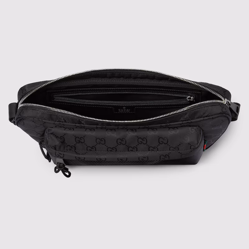 Burada yeşil ve kırmızı bir Web detayıyla tanımlanan bir askılı çantanın üzerinde görünüyor.