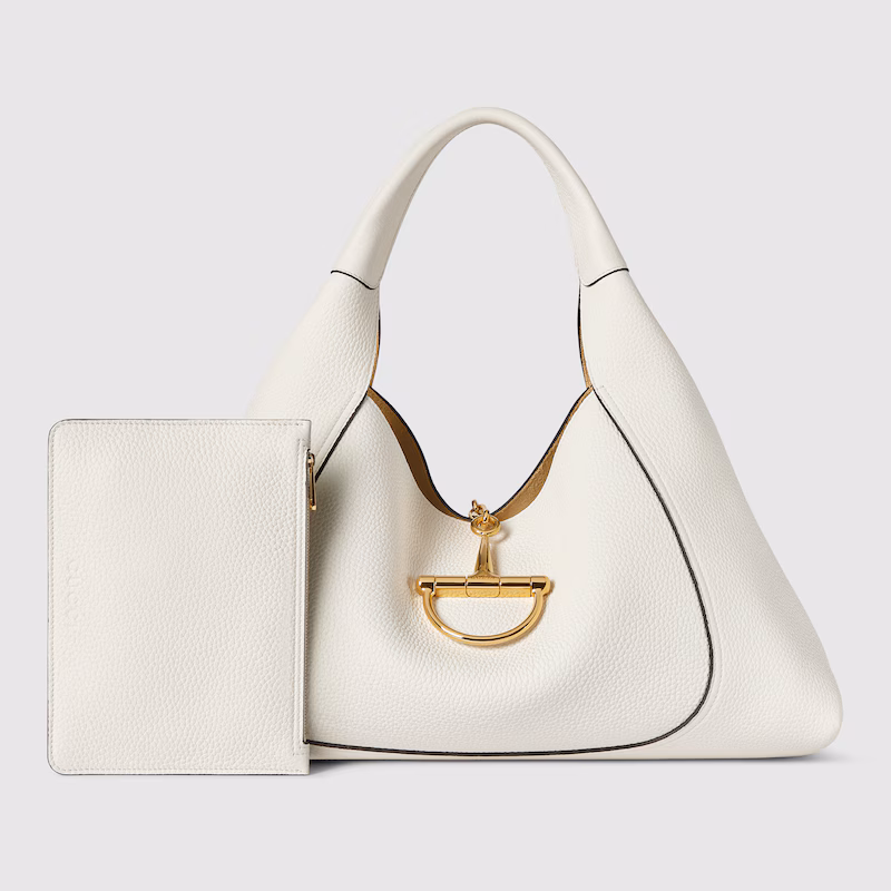Yeni Gucci Softbit omuz çantası, House’un imza donanımını büyük boy yarım Horsebit olarak yeniden yorumluyor. Esnek, taneli deriden ve zengin bir dokudan üretilen rahat silüetin manyetik kapanışı olarak hem estetik hem de işlevseldir.