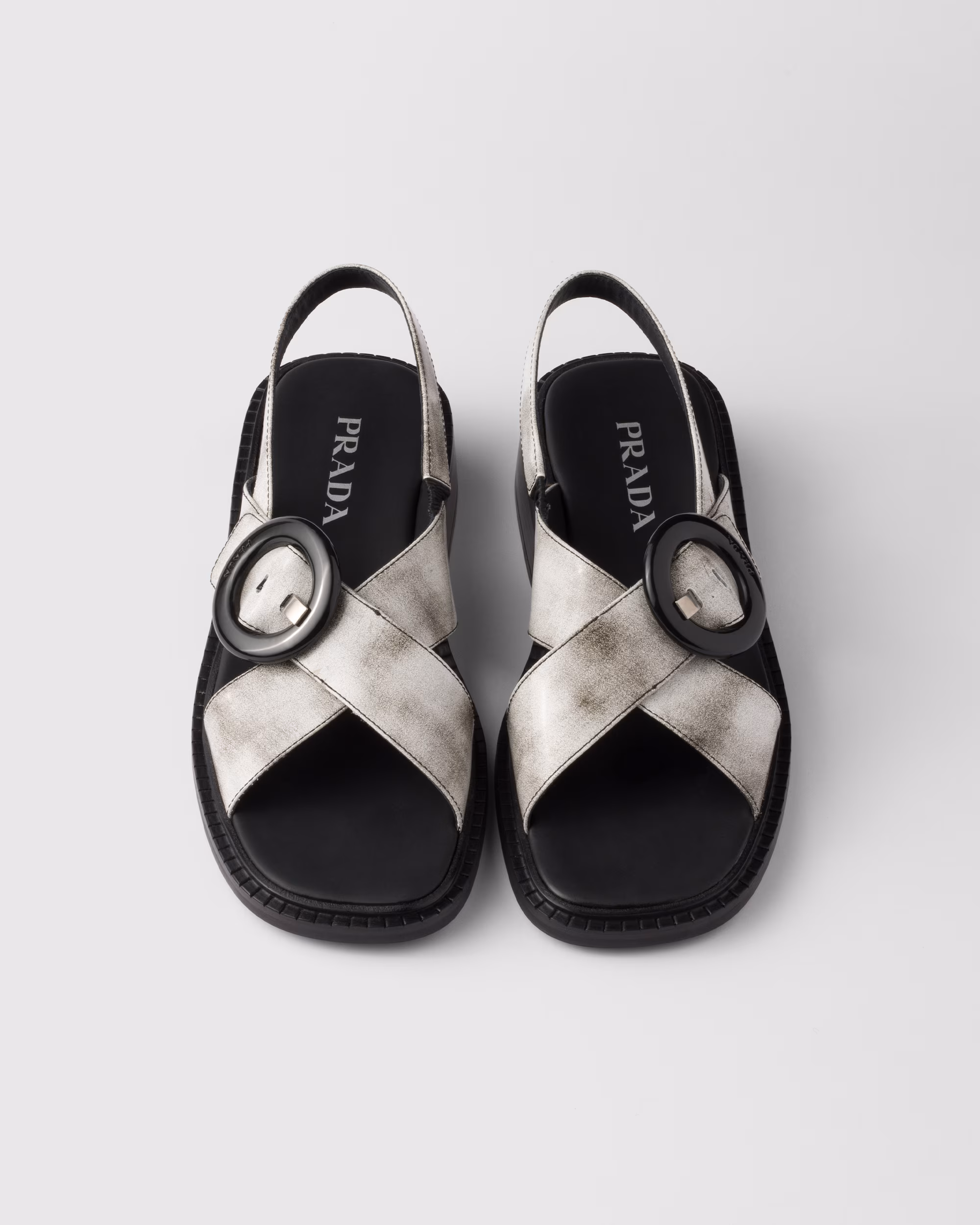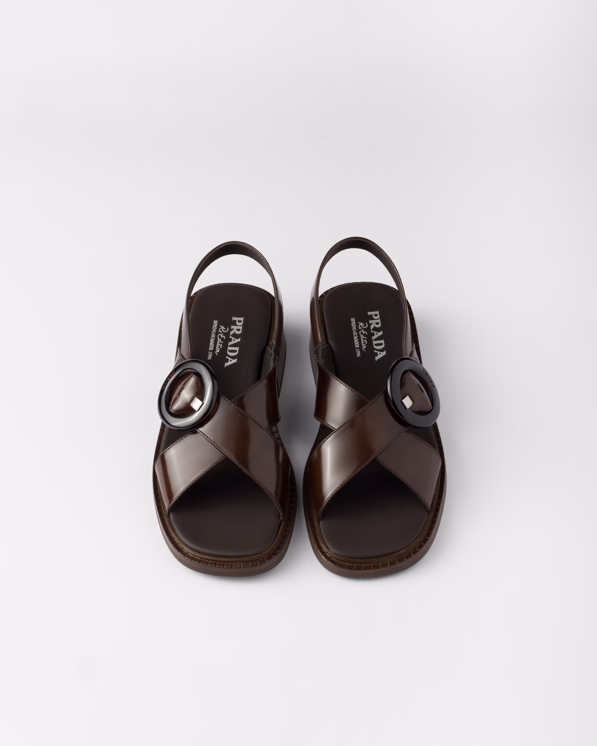 Prada’nın ikonik çapraz bantlı sandaletleri, yeni ölçüleri ve kauçuk ve deriden yeniden işlenmiş tabanıyla sezona yeniden yorumlanıyor.