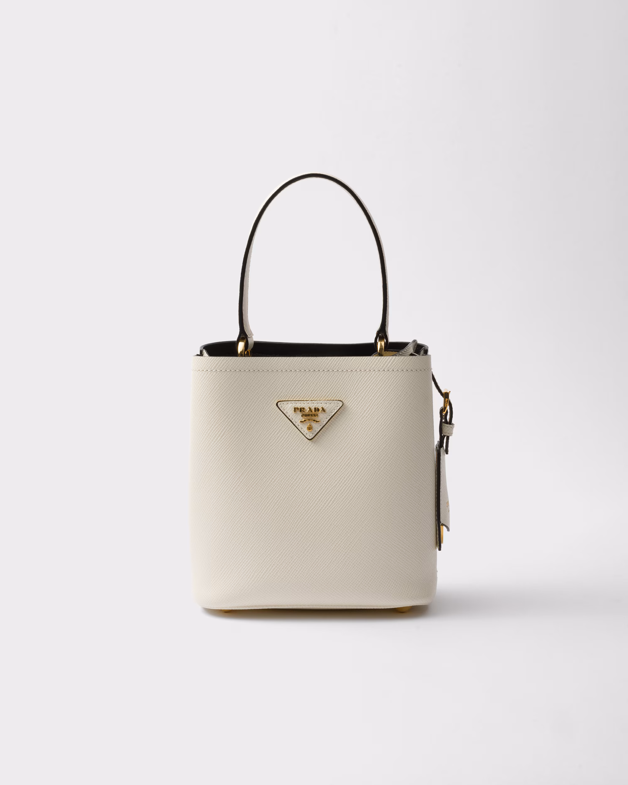 Prada Panier çantanın şık, geometrik silüeti, kompakt ve rafine bir mini versiyonda yeniden yorumlanıyor. Prada koleksiyonlarının simgesel bir malzemesi olan Saffiano derisinden yapılmış aksesuar, zanaatkar mükemmelliğini ifade eden sofistike detaylarla süsleniyor.