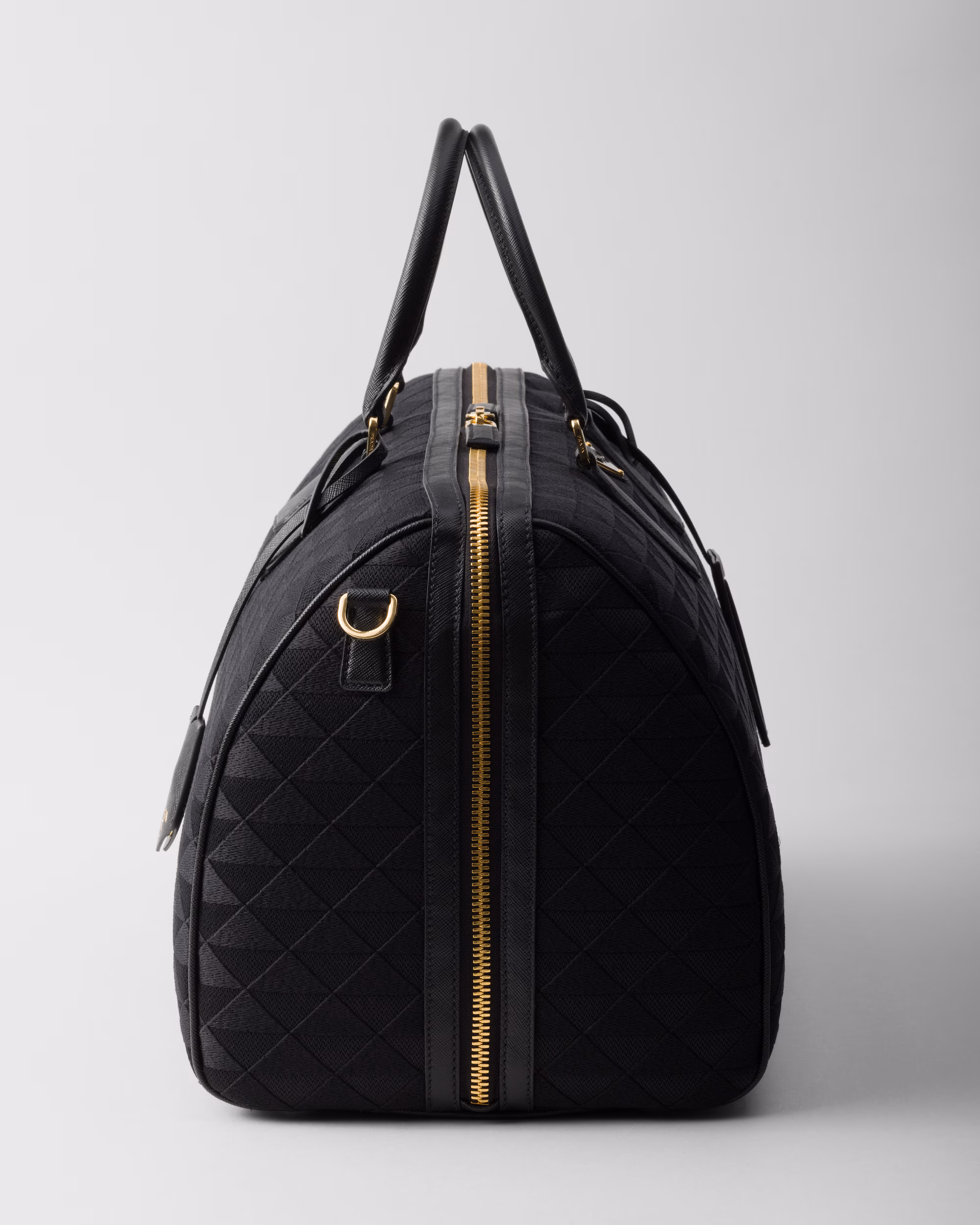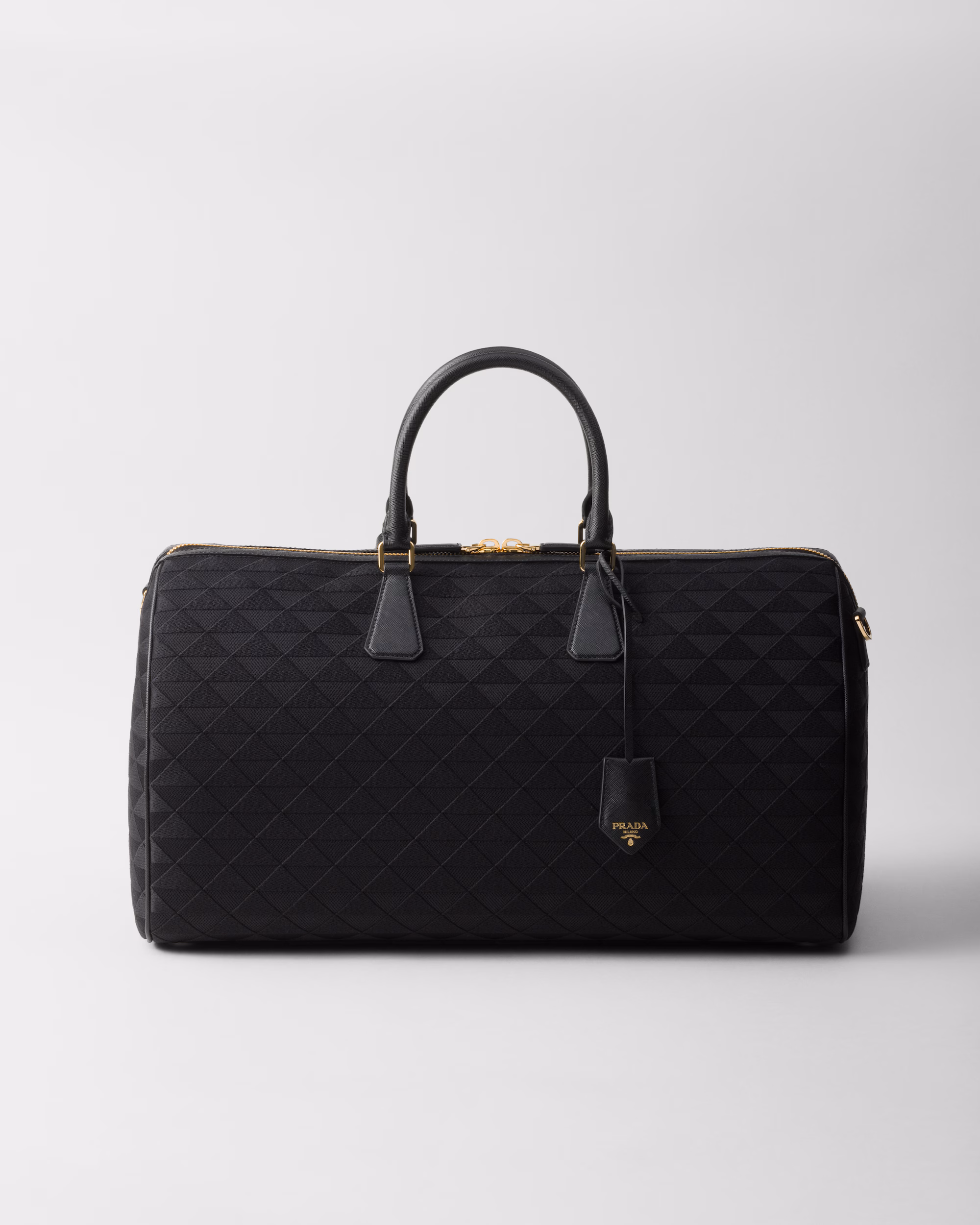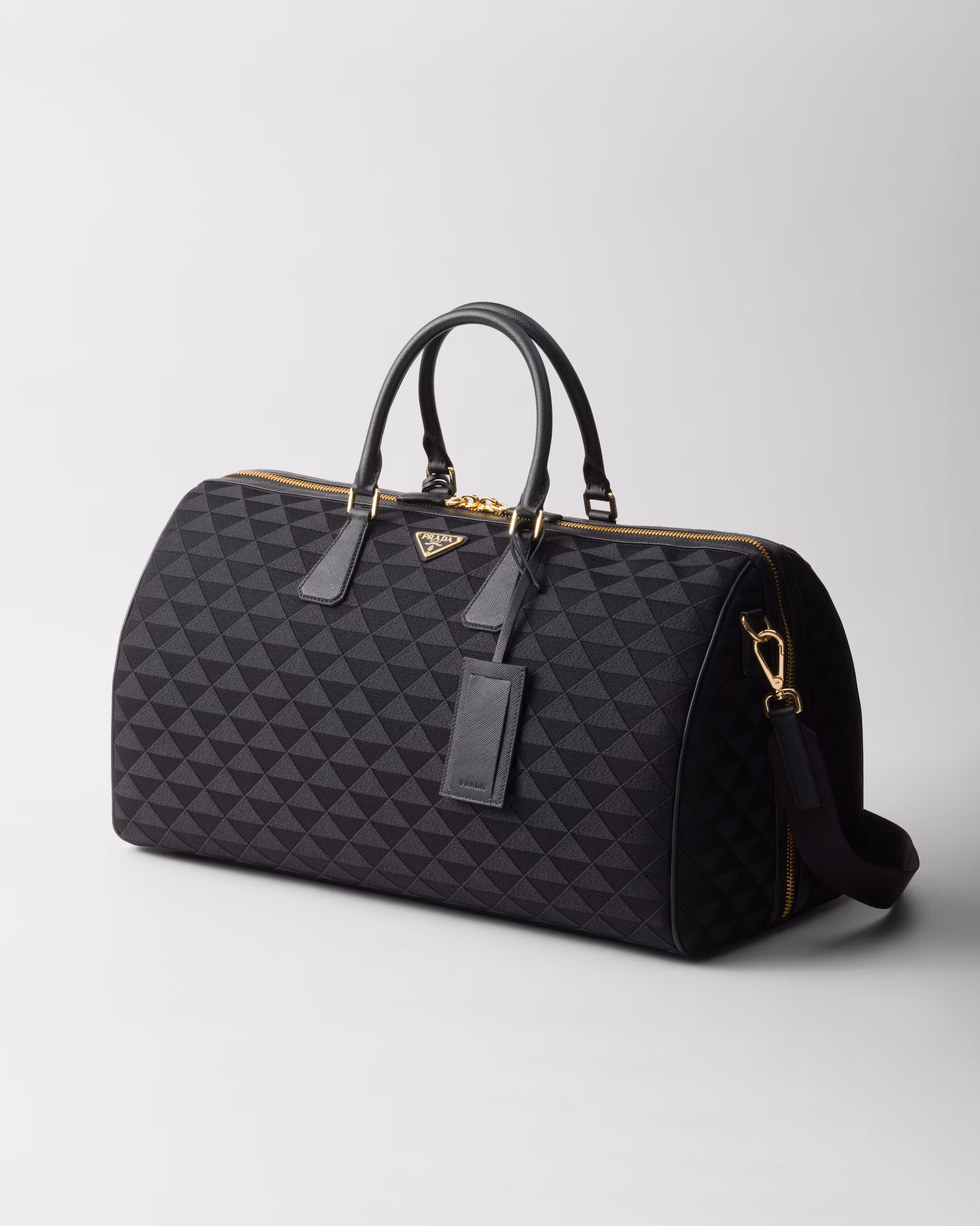 Deri detaylar ve ikonik emaye metal üçgen logonun yer aldığı bu kumaş spor çantası, Symbole motifinden esinlenerek tasarlanmış sofistike ve modern bir desenle süslenmiştir.