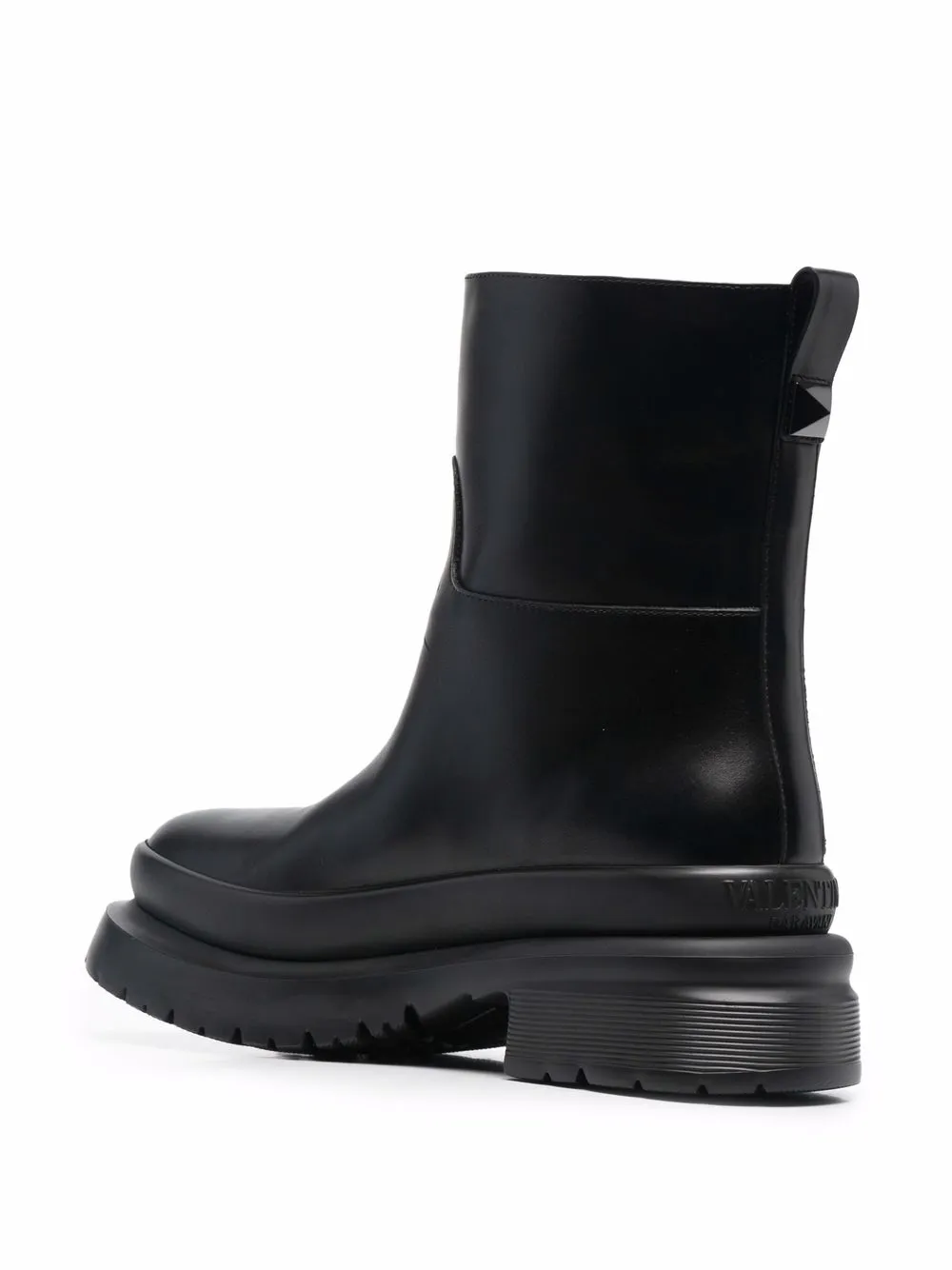 Tasarım olarak şık olan bu siyah deri bilek botu çifti, Valentino Garavani’nin AW21 koleksiyonunun bir parçası olarak sunuluyor. Alçak topuk ve kauçuk çıkıntılı taban üzerine yerleştirilen bu botlar, topukta tonlu bir Rockstud süslemesine sahip.